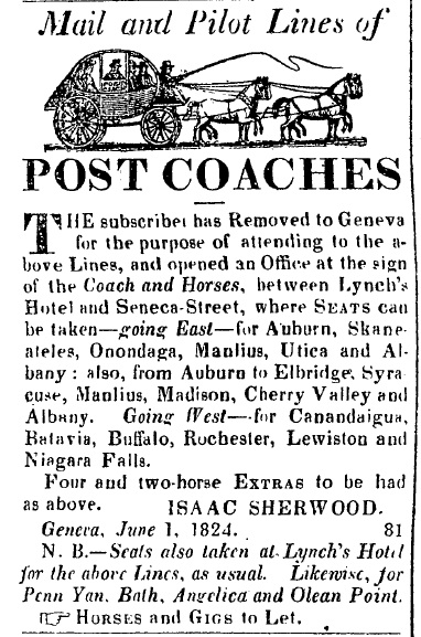 The subscribers will run a TWO-HORSE WAGGON, for the accommodation of Travellers, to and from Geneva to Troupville, on Sodus Bay, once a week, viz. leave Troupville on Wednesday the 28th of August, inst. at 3 o'clock, A.M. and arrive at Geneva in the afternoon; leave Geneva on Thursday the 29th, at 3 o'clock a.m. and arrive at Troupville in the afternoon. - The Fare for each passenger will be Two Dollars - Way Passengers, six pence per mile.